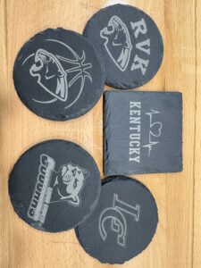 Laser cut /engraved wood, slate, acrylic. Ornaments, games coasters.