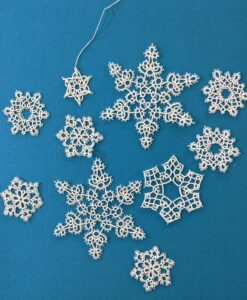 Hand shuttle tatted items. Snowflakes, jewelry, and bookmarks.